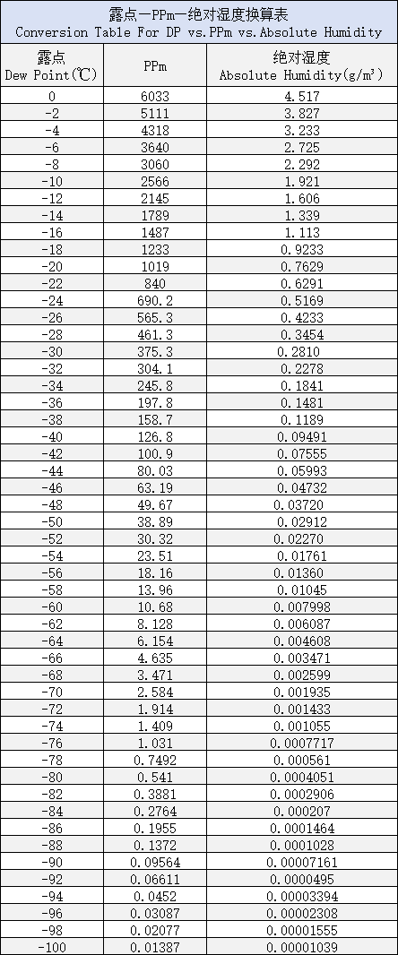 露點(diǎn)換算為濕度g/m³(20℃,101.3Kpa)