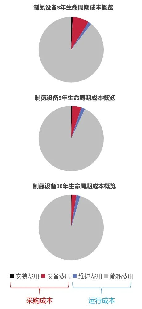 在我們購(gòu)買制氮設(shè)備的時(shí)候,相信大部分用戶首先關(guān)注到的是采購(gòu)成本,也就是我們上圖的安裝費(fèi)用和設(shè)備費(fèi)用。但制氮機(jī)設(shè)備價(jià)格差異較大,需要謹(jǐn)慎考慮,多方位對(duì)比,購(gòu)買時(shí)根據(jù)自己的實(shí)際情況進(jìn)行選擇。由于運(yùn)行成本占比大,且關(guān)乎后期使用,這里建議我們采購(gòu)前期就將其考慮進(jìn)去,前期通過(guò)條款把控后期運(yùn)行成本。